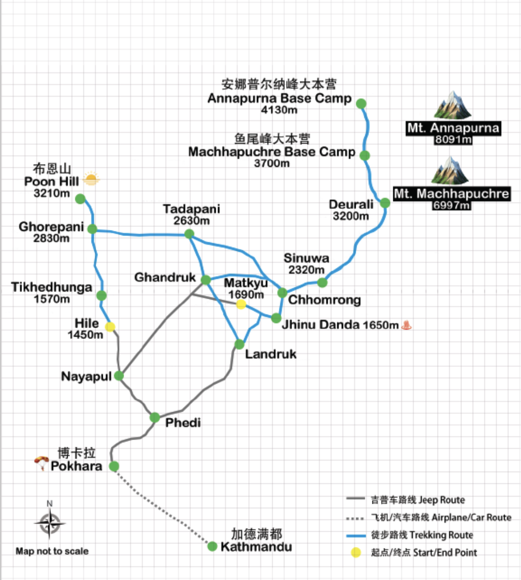 Especially during the spring season after Himalayan, there can be snowslides along the ABC route, so it's important to be with a guide. On the way to Poon Hill, you will encounter many donkeys used by local people for transportation of goods, please be alert and give them space on narrow trails.